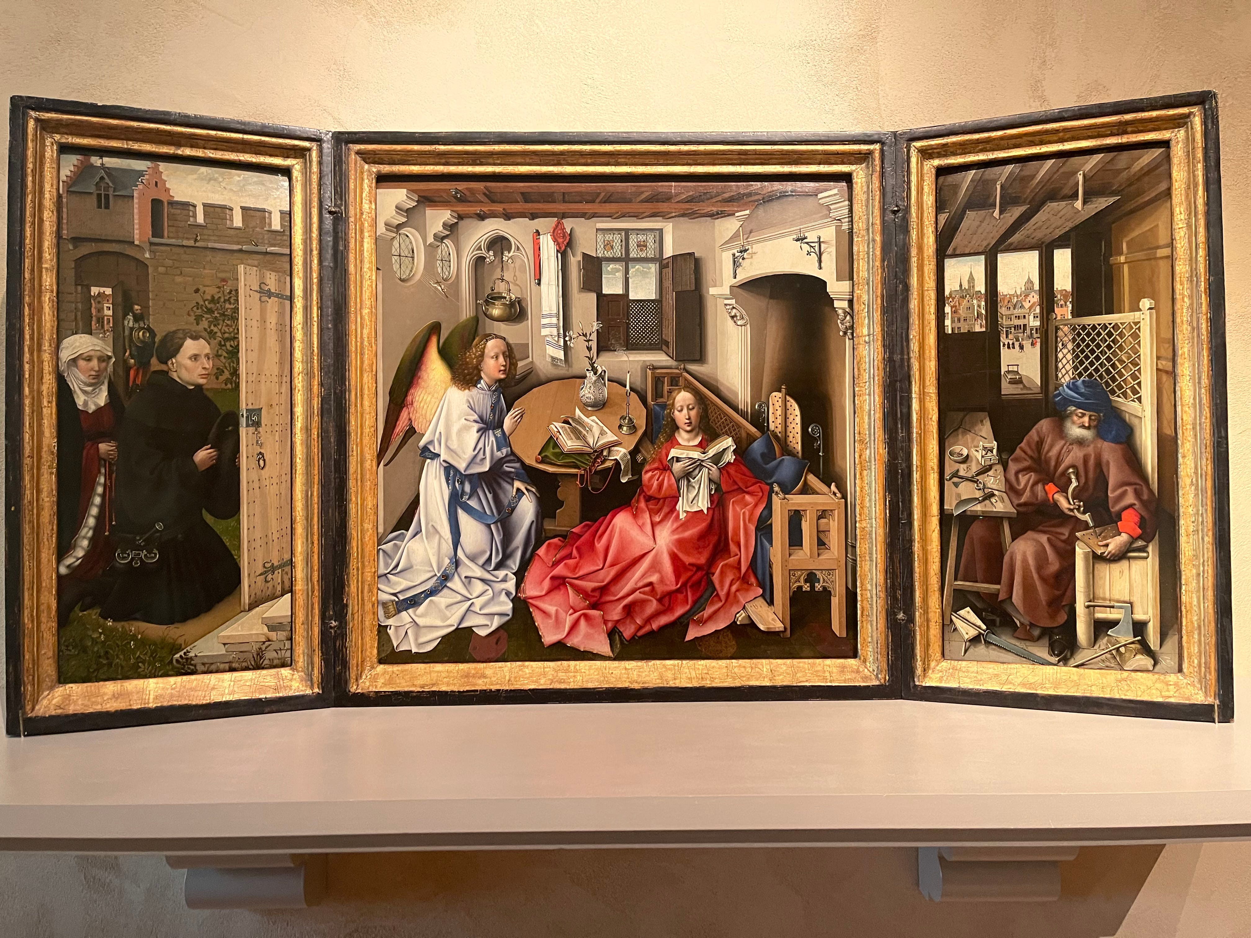 The Merode Altarpiece is a triptych, meaning it’s composed of three hinged panels. Because it is modest in size, it was likely designed as a private devotional object. Its panels bring together patrons, the Annunciation, and St. Joseph, weaving a narrative that was deeply personal for its owners.