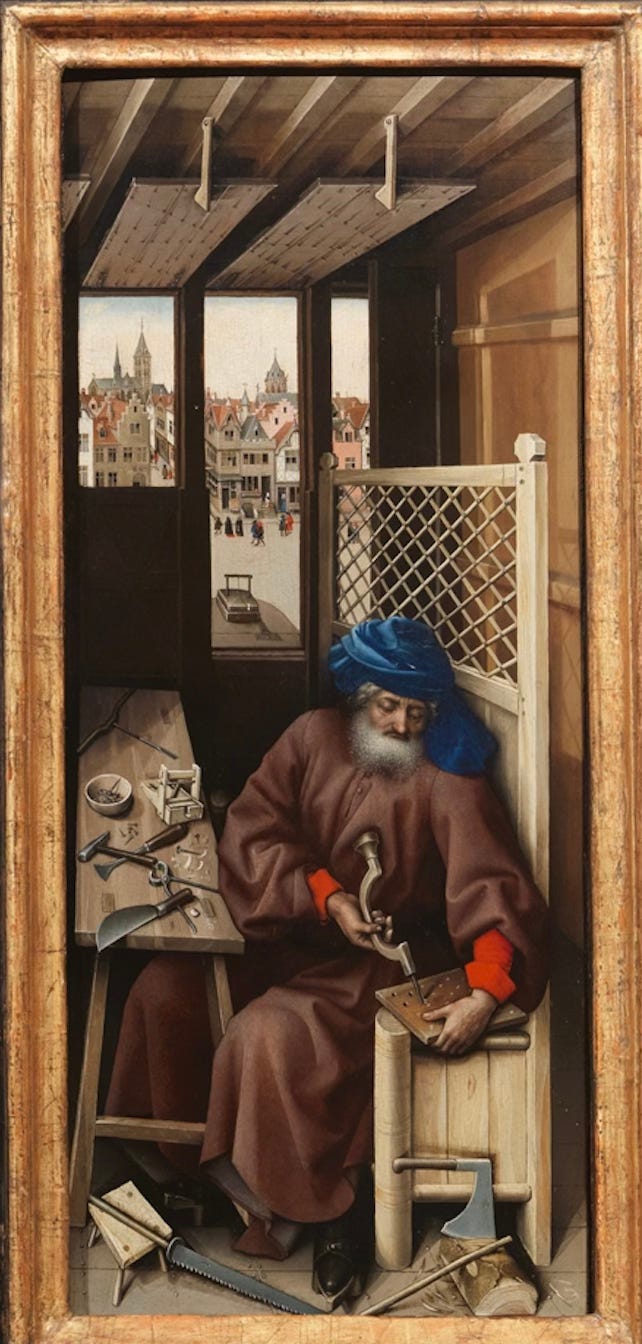 On the right panel, St. Joseph is shown at work in his carpentry studio, surrounded by his tools. He is building a mousetrap, a clever symbol of the Crucifixion: Christ’s sacrifice was believed to be a trap for the Devil.
