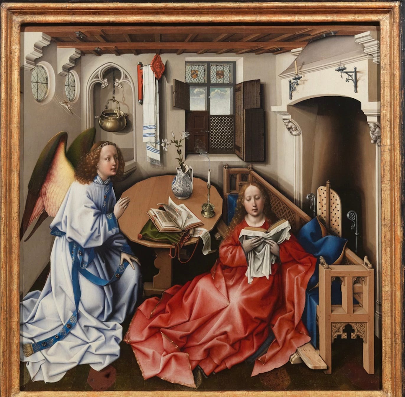 Once again, the sacred is grounded in the familiar to the intended audience because Mary sits in a tidy, middle-class Flemish interior.